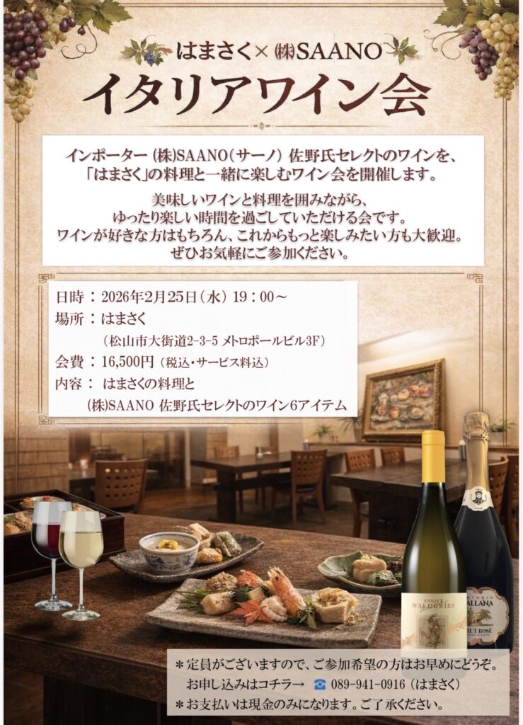 インポーター(株)SAANO(サーノ)佐野氏セレクトのワインを、「はまさく」の料理と一緒に楽しむワイン会を開催します。